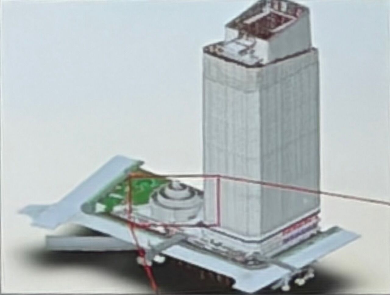 52街区の工事事務所が設置されている57街区に建設中の建物の外装部分が設置されました。