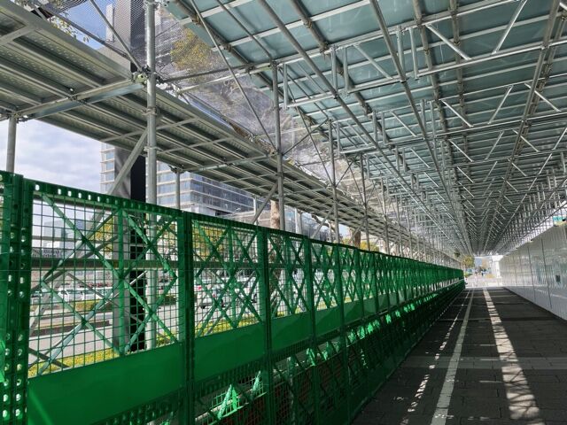 4月開業に向け工事が仕上げ段階に入っているロープウェイの新港埠頭側駅から赤れんが倉庫至近の新港中央広場までのペデストリアンネットワークがデッキ形態で着々と改良工事が進められています。