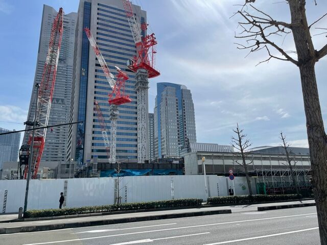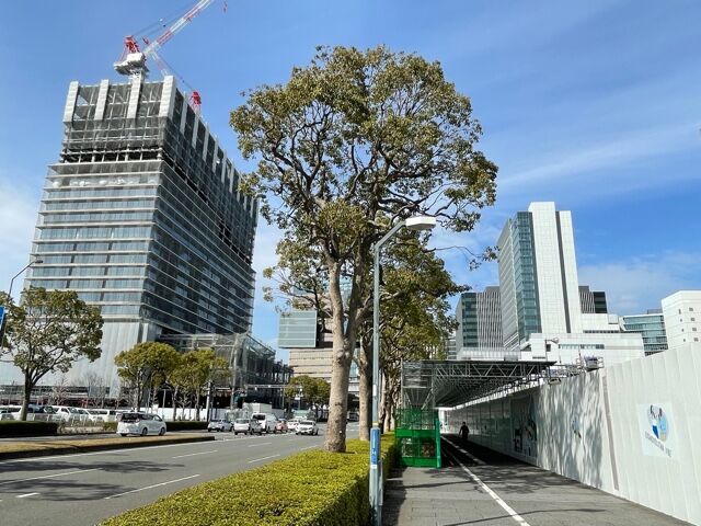 ロープウェイの開業に間に合いそうですね。駅もほぼ完成、門状のナビオス横浜側の緑地が少し削られ、歩行者用の舗装が施されました。