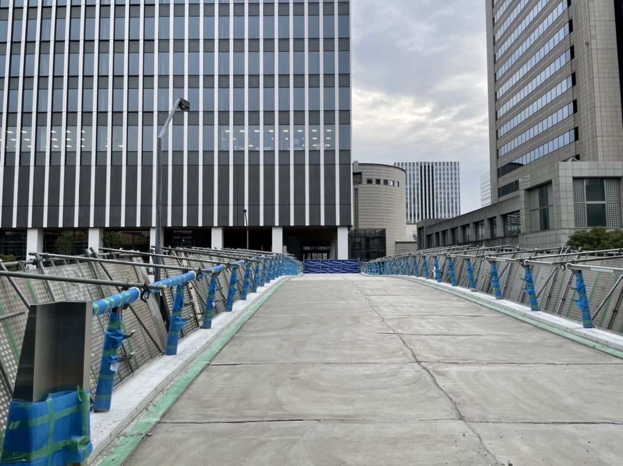 みなとみらい大通りを跨ぎぴあアリーナと結ぶペデデッキも仕上げ工事の真っ最中。