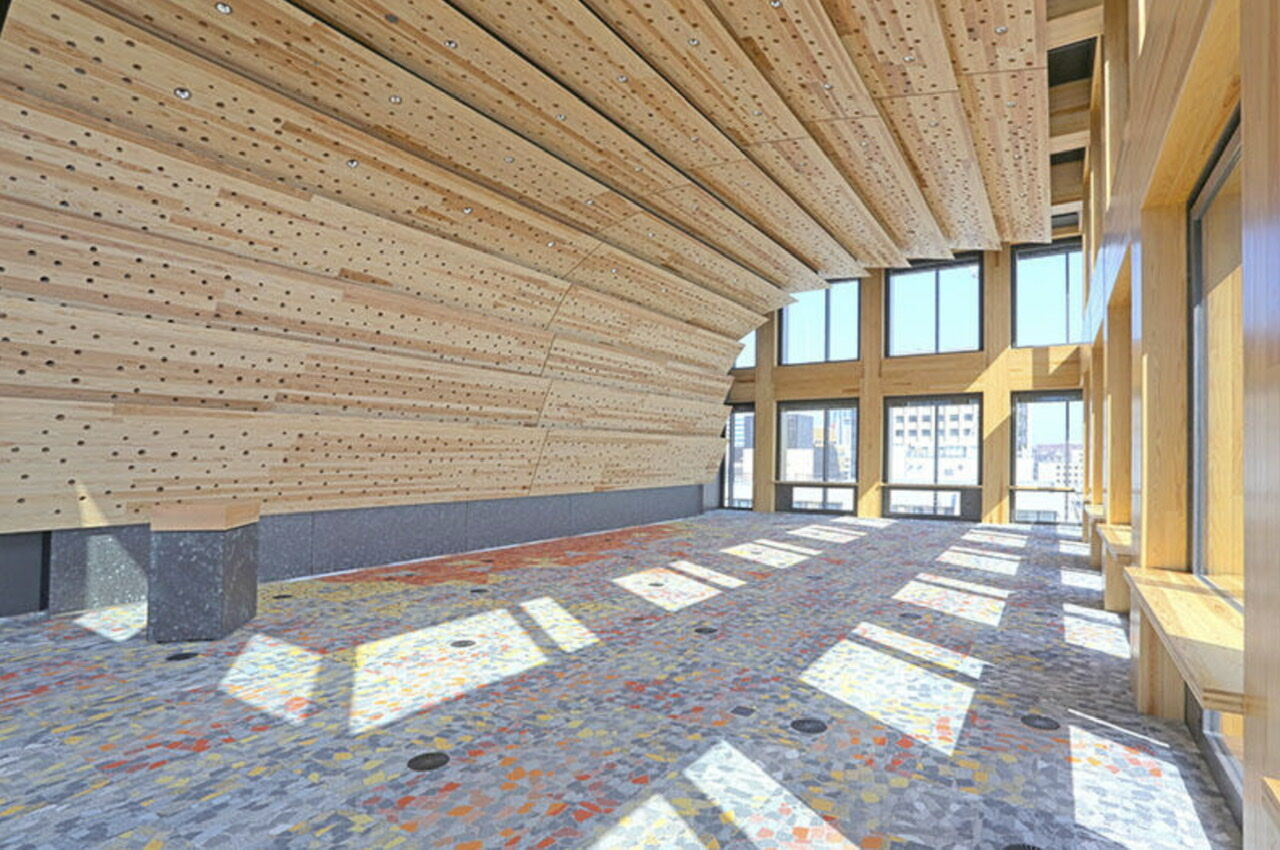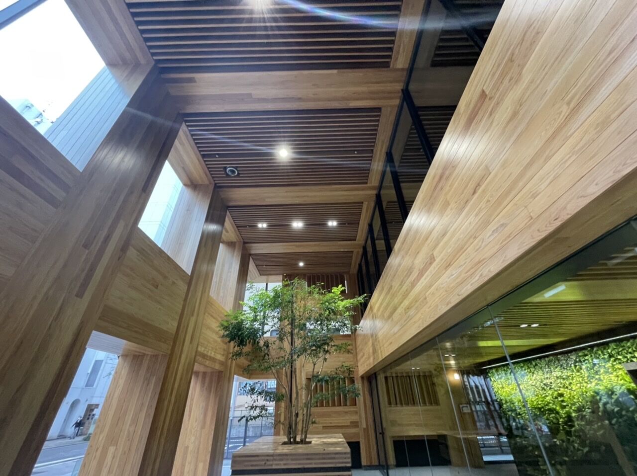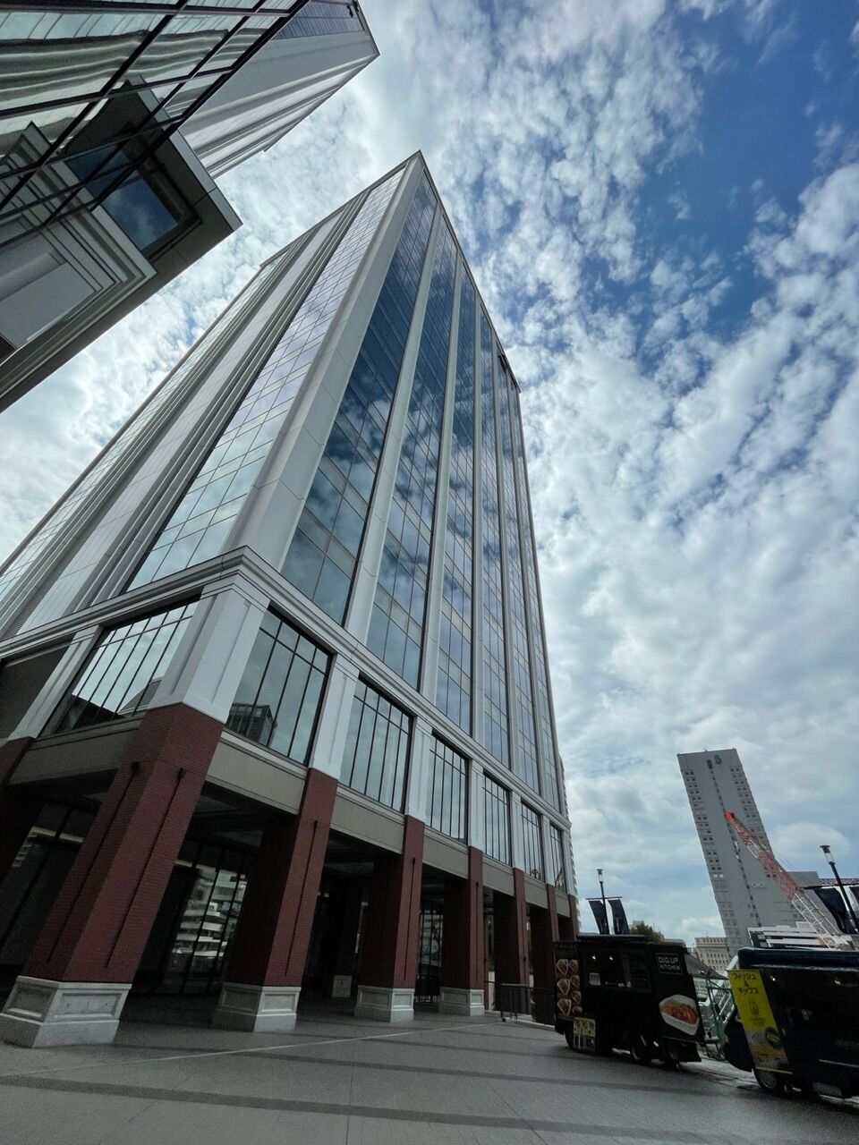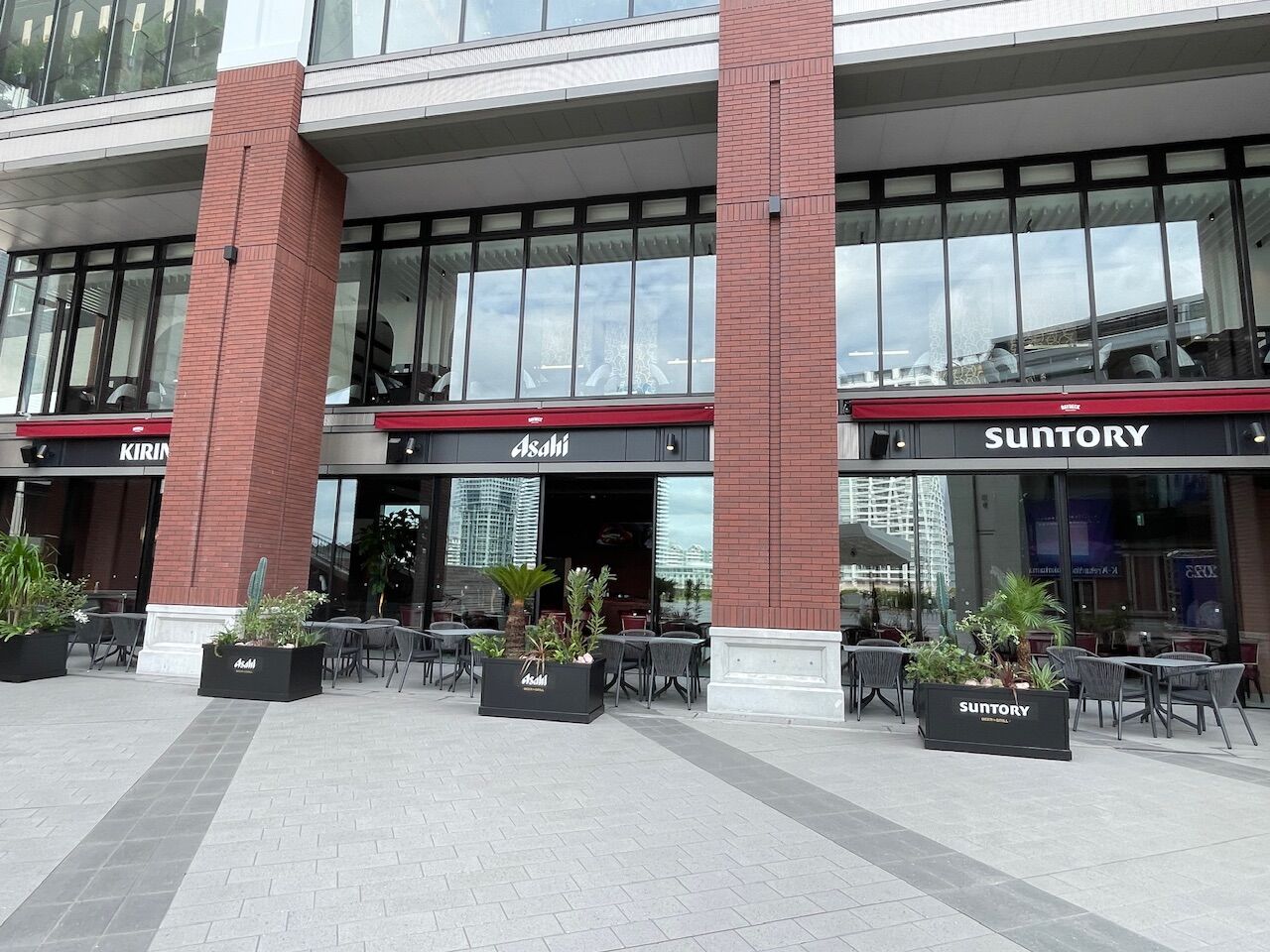 このパン屋前の机はお店を背に座ると、目の前に芝生広場が広がり、みなとみらい大通りの向こうに神大みなとみらいキャンパスが聳えます。この芝生空間がよく作用しているのか、通行量の多いみなとみらい大通り沿いとは思えない、ゆったりした感覚にさせてくれている感じでした。