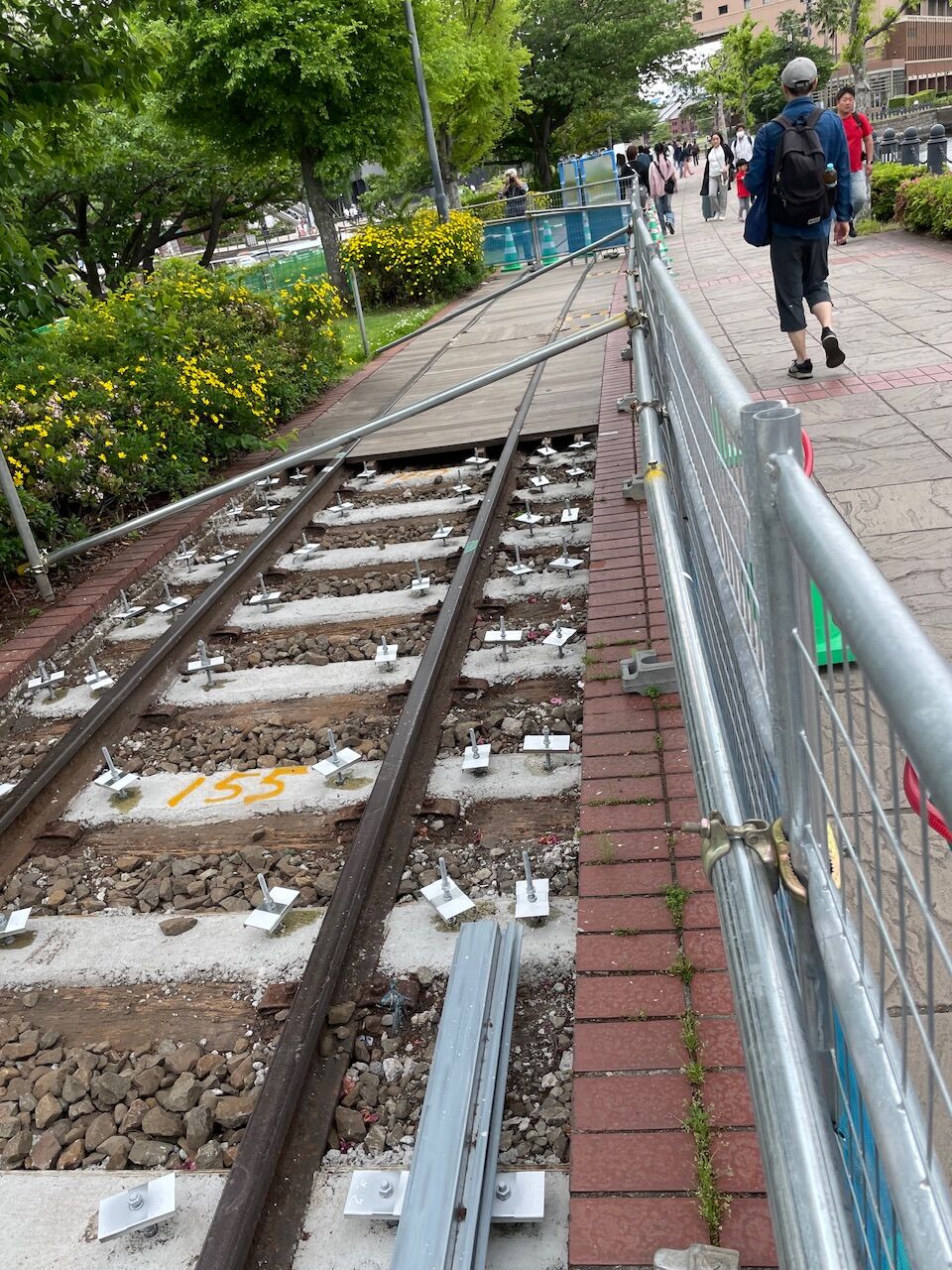 現場はまだまだ地盤構築中という感じで既存道路を付け替えつつ、