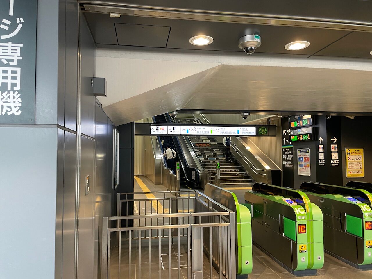 根岸線のホームは折り返し用の中線を挟む感じで2本あったホームを南端で繋げてそこに昇りエスカレーターとエレベーターが設置されています。